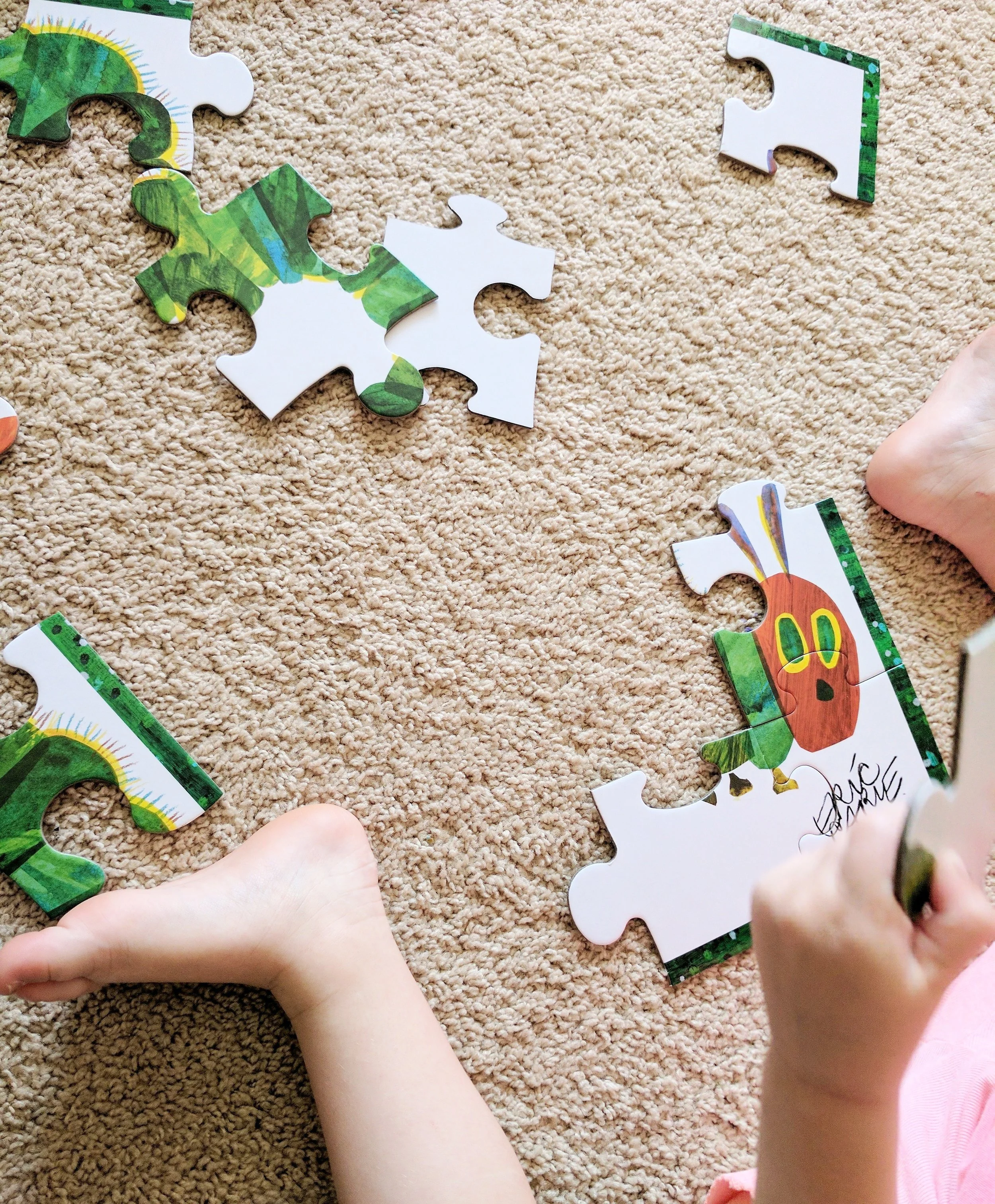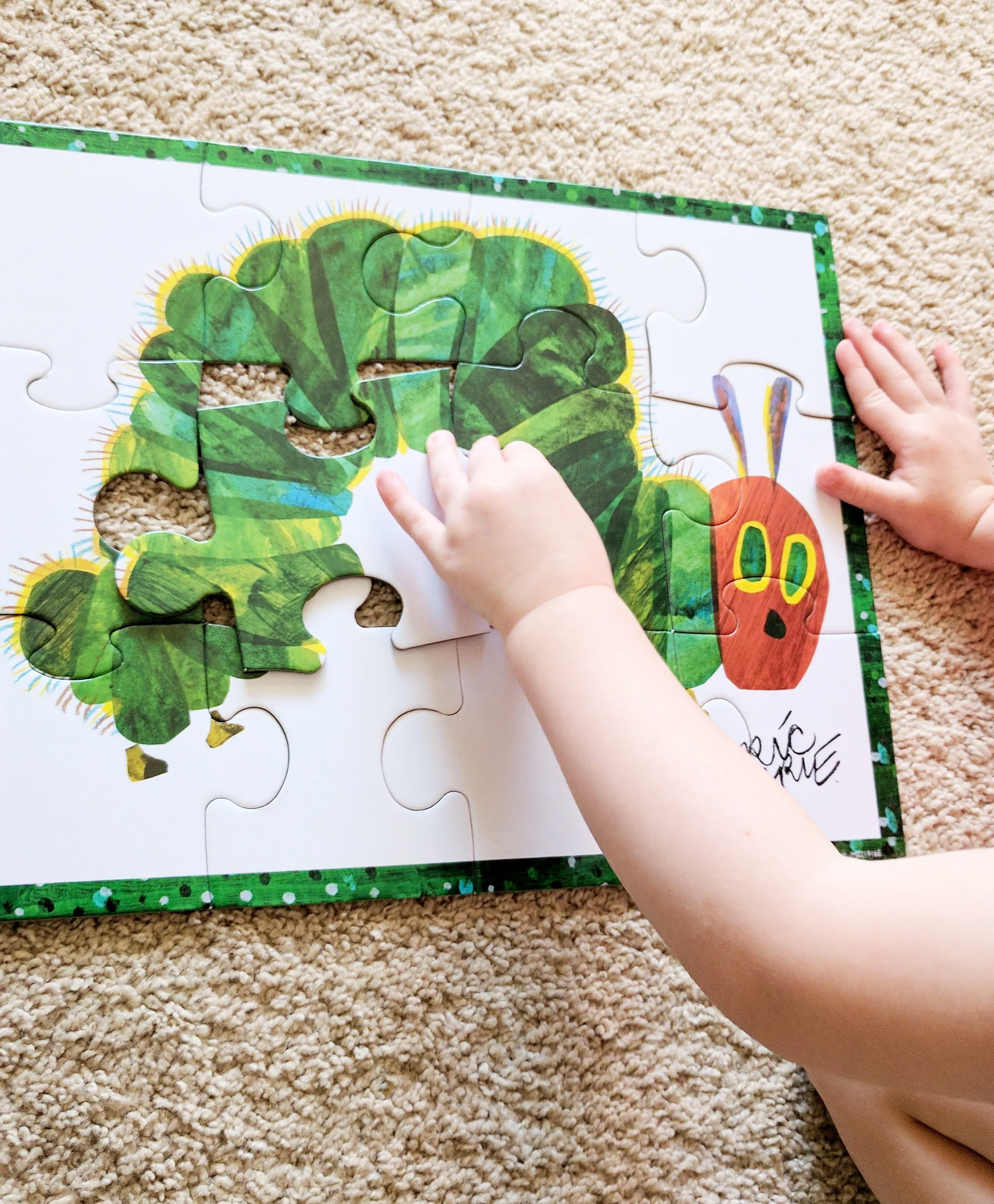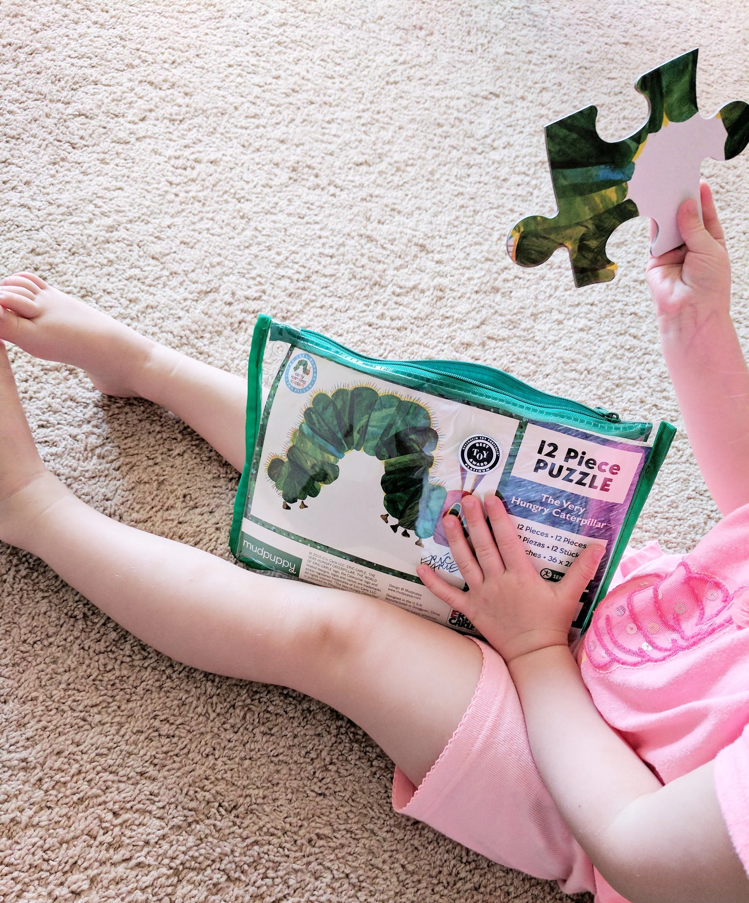 Our new travel puzzle from Mudpuppy was perfect for Emma! She loved seeing the caterpillar from her books and was able to complete it all on her own!