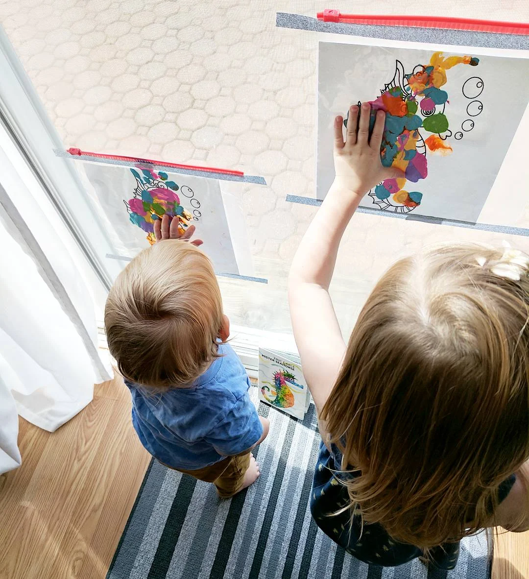 We pulled out our DIY light table to make chameleons to hang in the playroom window. I used clear, adhesive paper and traced the cover of the book. I gave the kids tissue paper to decorate and work on fine motor skills.