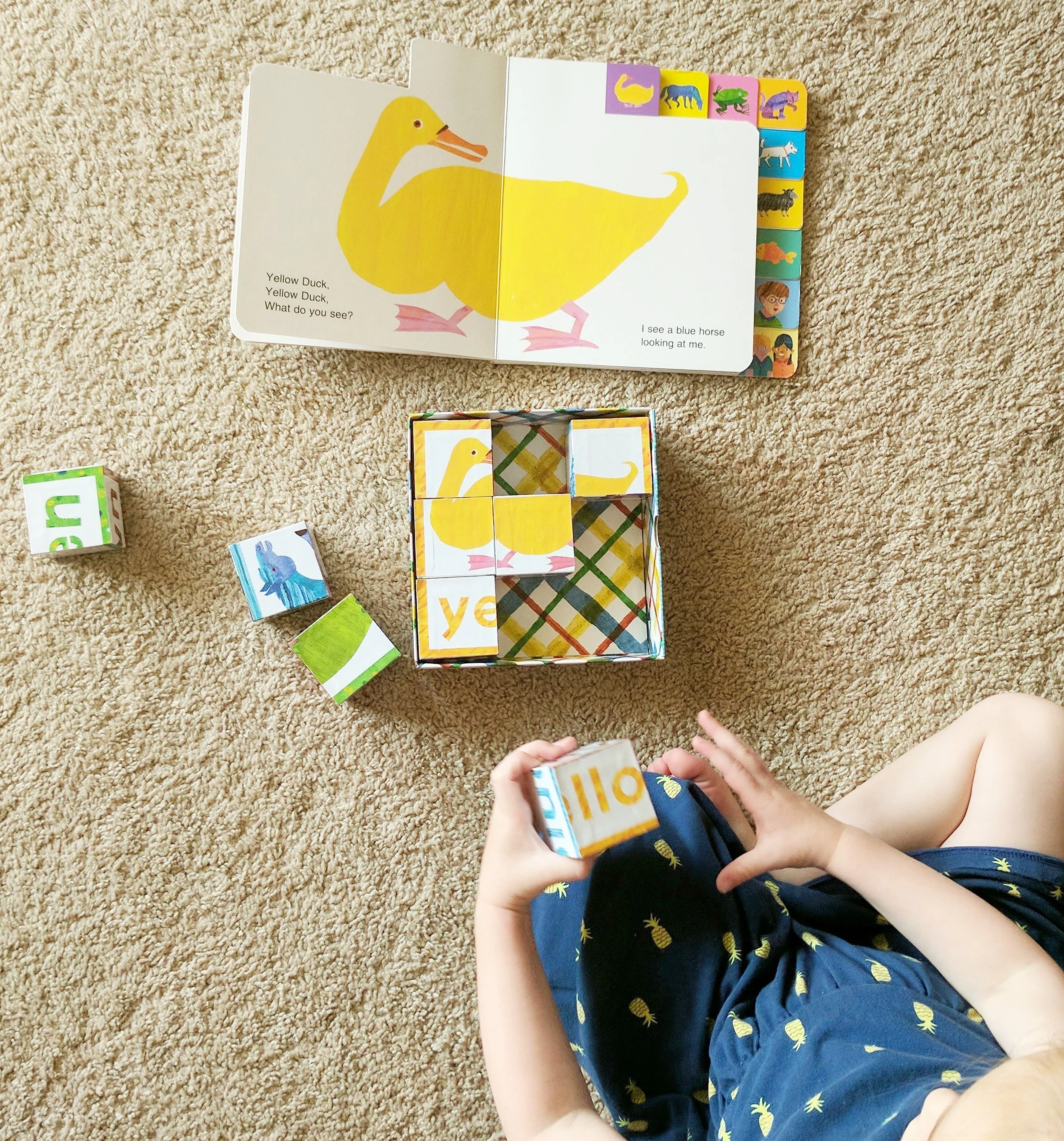 Our favorite puzzle in this theme was our Brown Bear Block Puzzle. Emma loved to find the character in her book and then spin each block to find the right side and fit it into her box.